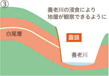こうして地上に現れた地層ですが、そのままでは平面でしか観察することができません。この地層の断面が露出して観察できる場所(「露頭」と呼びます)が現れたのは、市内を南北に流れる養老川が地層を侵食したためです。